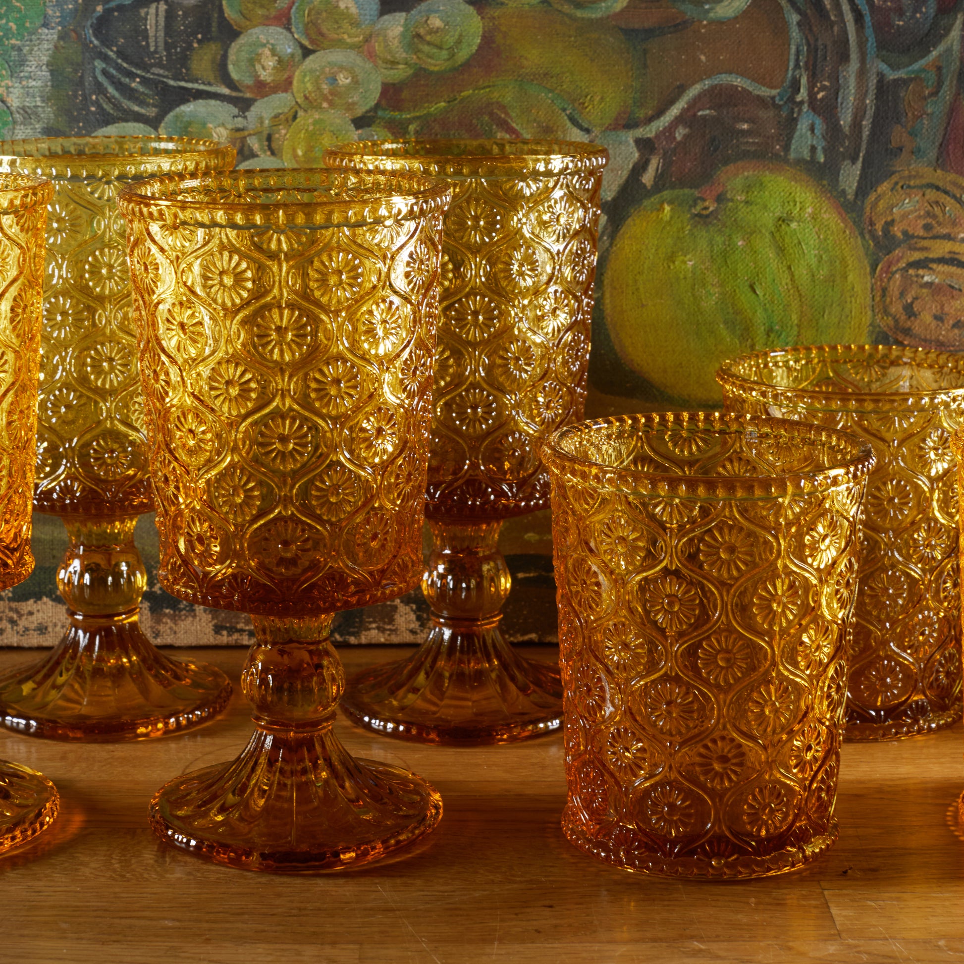 These vintage style glasses effortlessly transition from every day to special occasion. Their versatile design with intricate raised detailing makes them an essential to your home and event decor arsenal. Whether stemmed or not, the 8 oz. capacity makes both styles suitable for a wide range of beverages. Though glass, their premium construction ensues their durability. Dishwasher safe. Not tempered. Sold in sets of 4