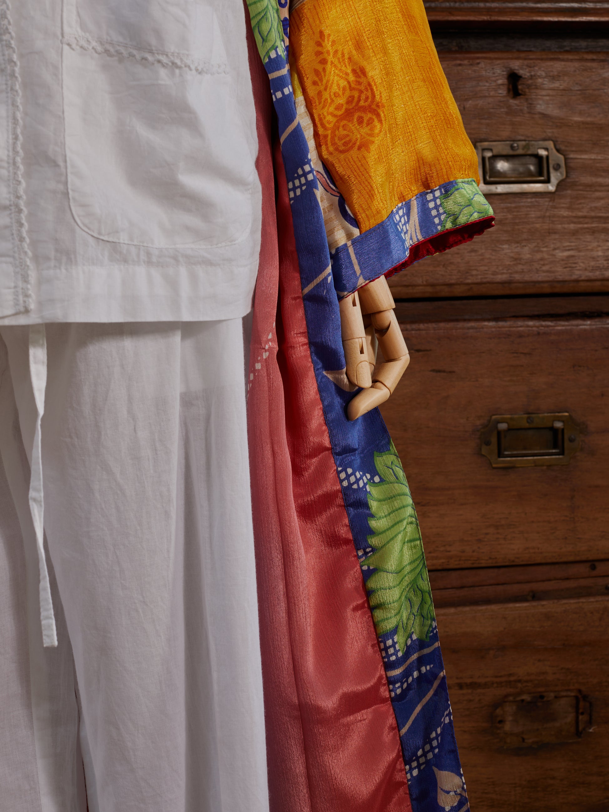 Each Silk Sari Patch Kimono is crafted from vintage saris in the villages of India. The silk kimono versatility means wearing it morning over coffee, as daywear over your favorite jeans, or as glamorous evening wear. Each is one of a kind. Fully reversible with pockets and a coordinating sash. The kimono measures 54” from shoulder to hem. Because each are handmade from ‘vintage Saris’ there will be slight imperfections which only adds to their unique beautiful story. 100% Silk. Dry cleaning recommended