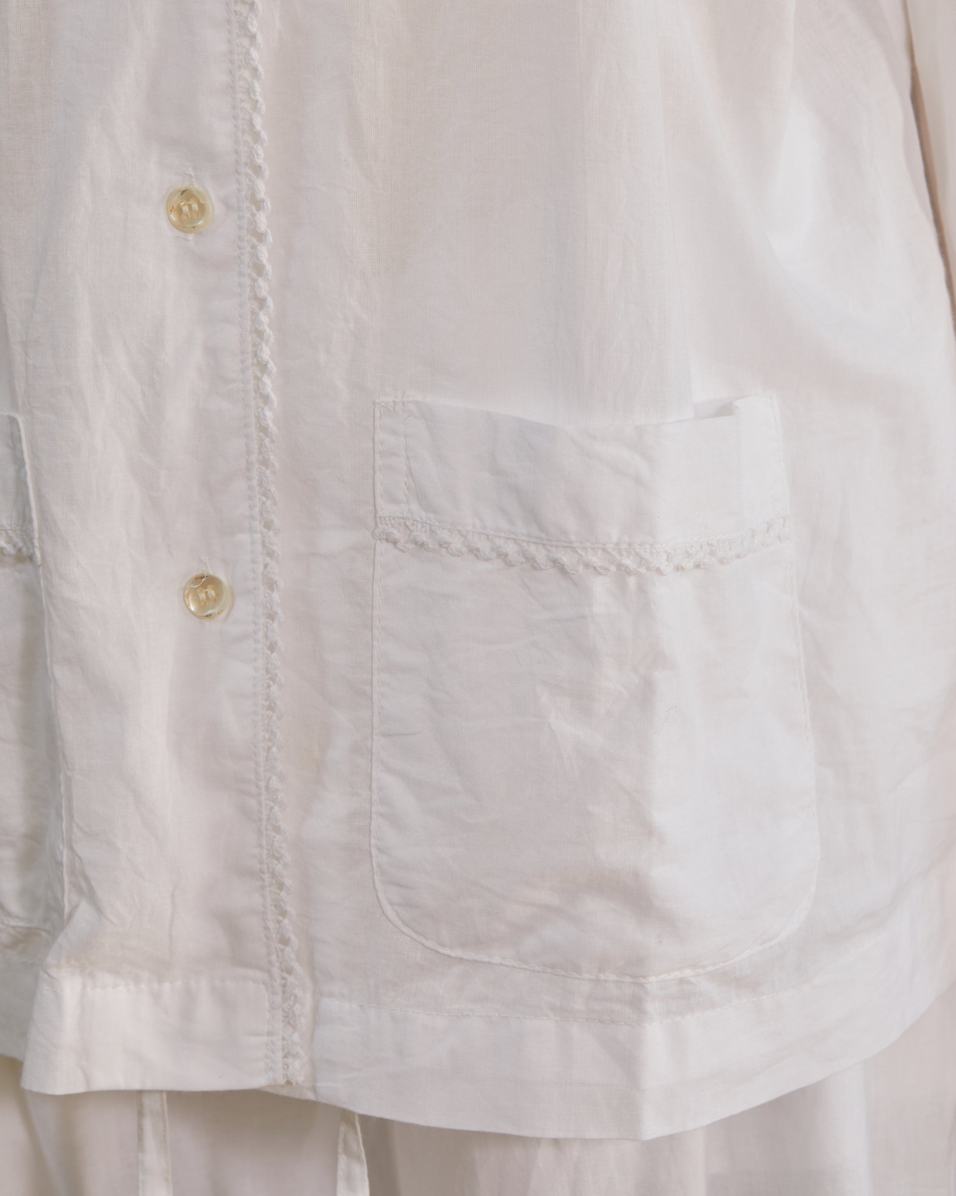 Made from the softest light weight Indian cotton. The button front top is trimmed with crochet detail and has two patch pockets. The bottom has an elasticized drawstring waist and 2 side seam pockets. Fits true to size. 100% cotton. Machine wash gentle.